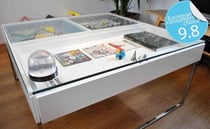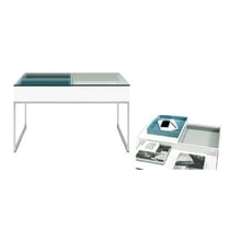 Now, a new coffee table includes storage on display. The glass top reveals a set of drawers underneath that can be opened with a gentle push for easy access. Personal and favourite pieces can be placed in the drawers for a very decorative and unique table. The Occa table is available in high gloss white and with a choice of many different leg designs. You can have drawers all in white or enjoy a colour combination of white, grey and blue.