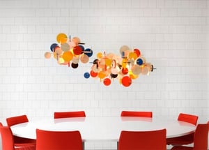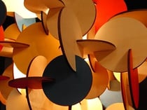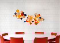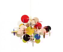 The design is based on interlocking geometric circles, sticking out in all directions. Bau has an immediate pattern that is broken up by the discs' colours, sizes and off-centre linkages, making the lamp living and organic in its expression.